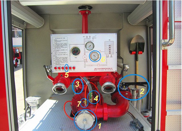 打開(kāi)車(chē)輛總電源→打開(kāi)儀表板電源按鈕→打開(kāi)車(chē)輛取力器→打開(kāi)吸水口接吸水管→打開(kāi)真空泵開(kāi)關(guān)(吸水口上面)→打開(kāi)引水控制按鈕→打開(kāi)后注水按鈕→車(chē)輛給油(真空表達(dá)到0.04MPa)→關(guān)閉引水控制→關(guān)閉真空泵開(kāi)關(guān)→觀看液位表→吸水完成