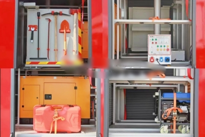 駕駛室頂部前端為長排警燈,車身后配有24V/60W火場照明燈一只,車輛兩側(cè)上方各配有紅藍相配的爆閃燈,下方安裝安全標(biāo)志燈,乘員室、器材箱、 泵房內(nèi)均裝有照明燈,加裝有100W警報器,回轉(zhuǎn)警燈開關(guān)、通訊設(shè)備預(yù)備接口。